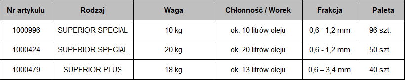 • Absorpcja: 1 litr sorbentu wiąże 0,53 litra oleju (bez nacisku).
