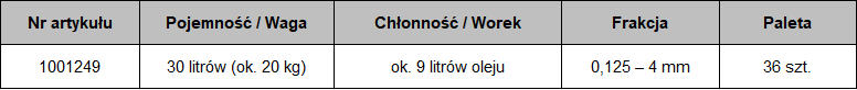 ◦ 1 kg sorbentu wiąże 0,46 litra (0,38 kg) oleju.