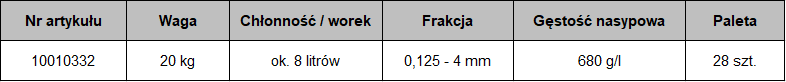 - Absorpcja (Olej): 1 kg sorbentu wiąże 0,40 L oleju; 1 L sorbentu wiąże 0,31 L oleju.