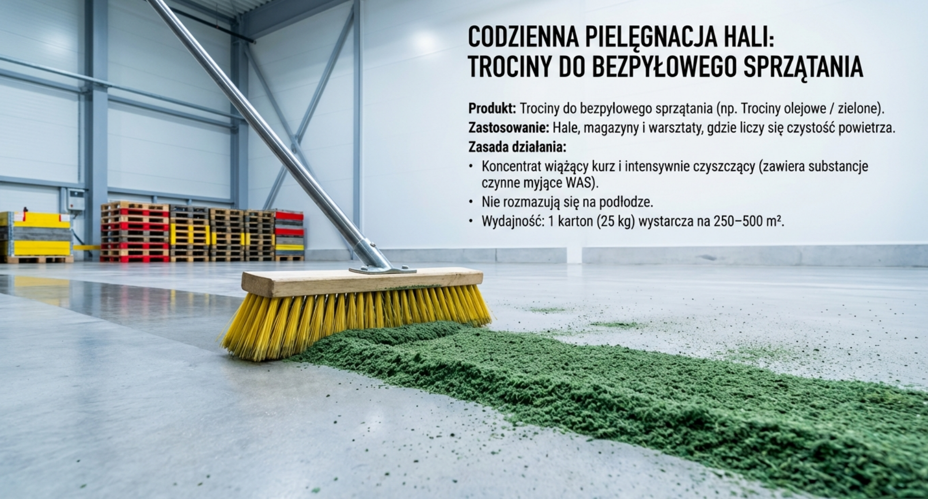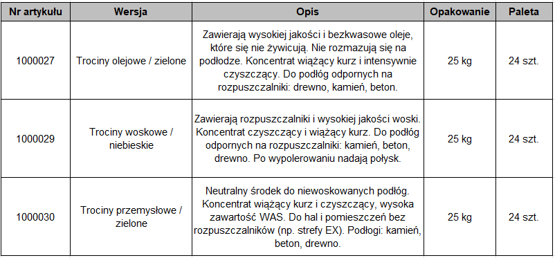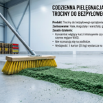 Rozsypać trociny do zamiatania w jednej linii na podłodze i przesuwać je przed sobą tak jak przy normalnym zamiataniu. Na mocno zabrudzonych miejscach wetrzeć trociny miotłą. Używać wyłącznie mioteł o średnio twardym włosiu, np. z arengi, kokosa, elastonu, bahii itp.